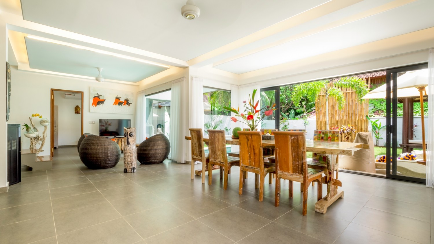 Set amidst vibrant and freshly-cut green grass is the 8-meter swimming pool at Villa that not only provides a place where you can enjoy the morning sun but also ensures that you can breathe in ample fresh, clean air! The quaint pool deck is furnished with sun loungers and beanbags found under parasols that you can sunbathe or lounge on. Towering palm trees cast their shadows on the garden, a cozy spot to nap under! A traditional, Balinese bale stand on the garden as well, with a comfortable daybed for dozing off to indulge in an afternoon siesta.