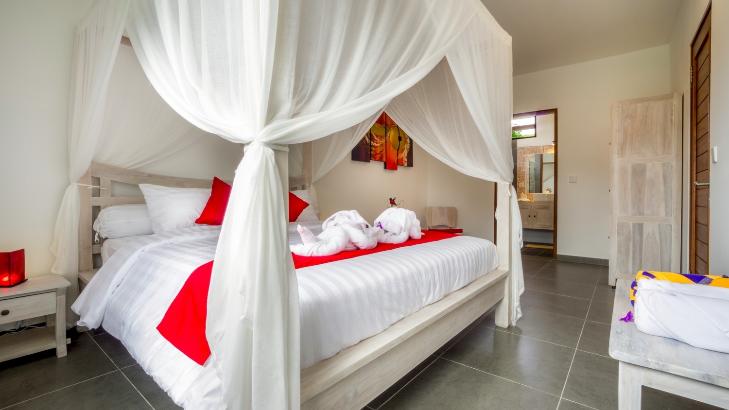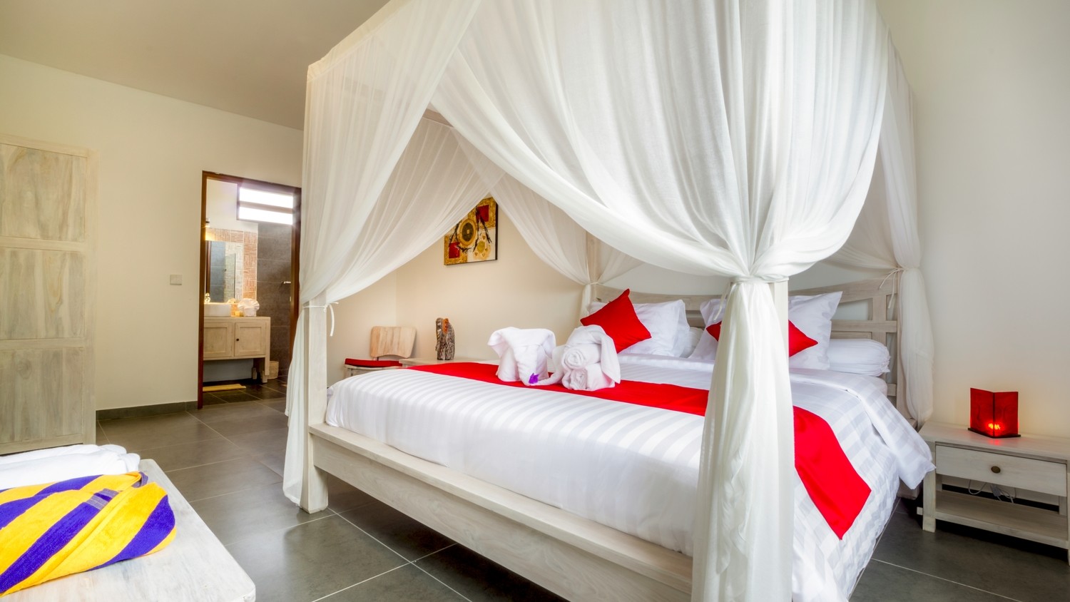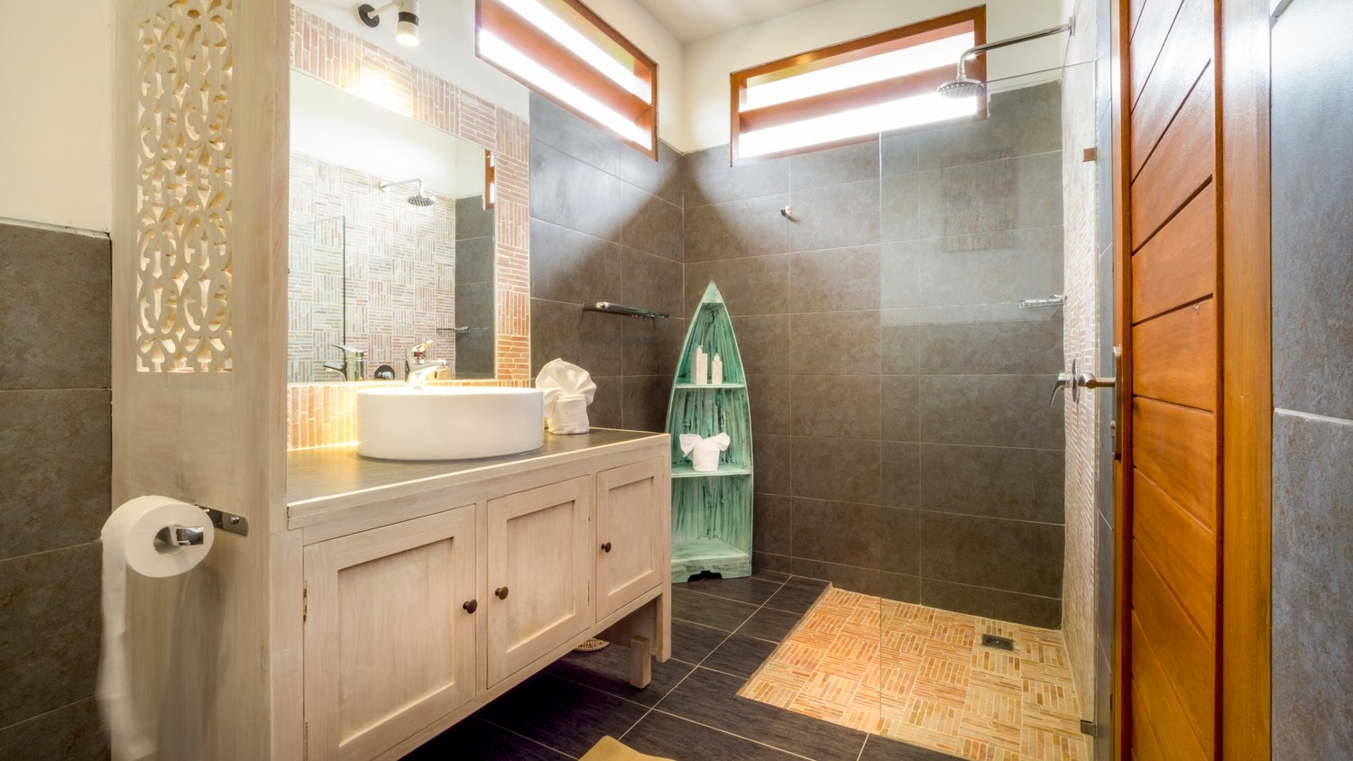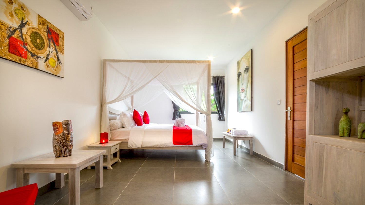 This villa is boasts of three, identical villa suites furnished with king-sized beds that are found either beside the garden or upstairs. Offering a private sanctuary to guests, the bedrooms are also air-conditioned to keep them at a more comfortable temperature during hotter hours of the day. The simple furniture is offset by bold artwork that brings everything together. Each bedroom comes equipped with an en-suite bathroom as well, all of them fitted with shower areas and other amenities.
