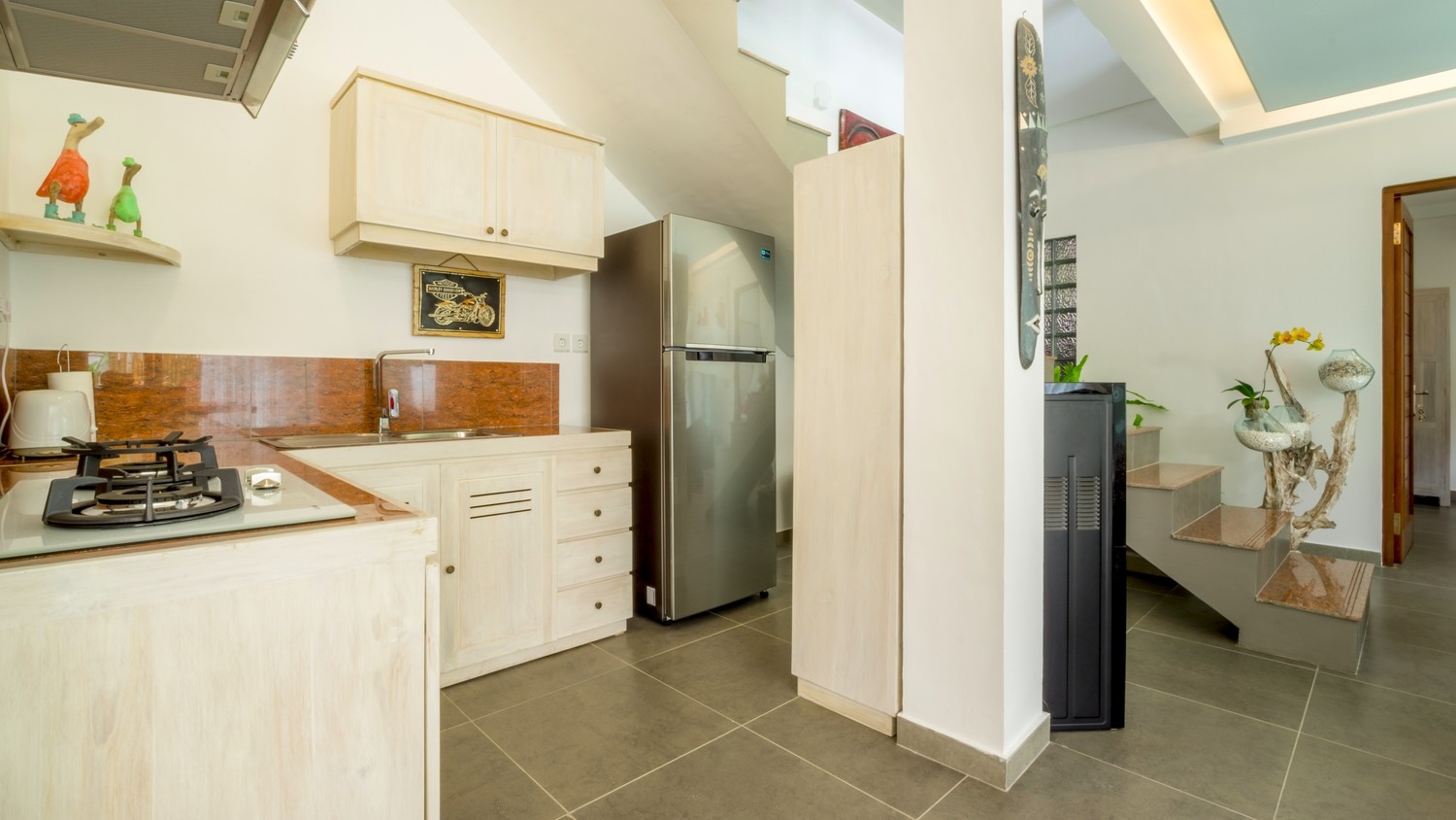 The dining area is found downstairs right next to the glass doors so you can indulge in the view as you relish the tasty food. With seating for 10 guests easily, the hand-painted chairs of the dining table add a bright countenance to the living room, making it all the more lively and vibrant. A fully-equipped kitchen that is also open to the dining and living area is found right beneath the staircase fitted with modern amenities like a refrigerator, a water dispenser, and others!