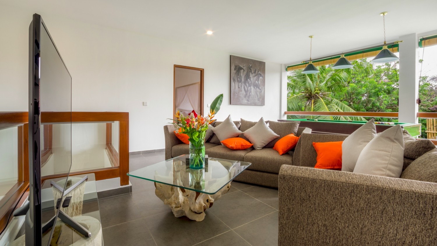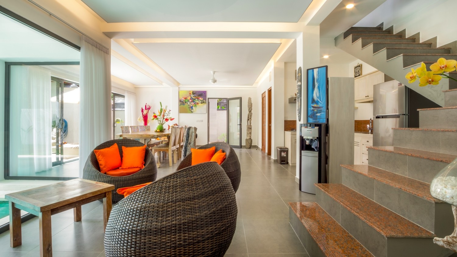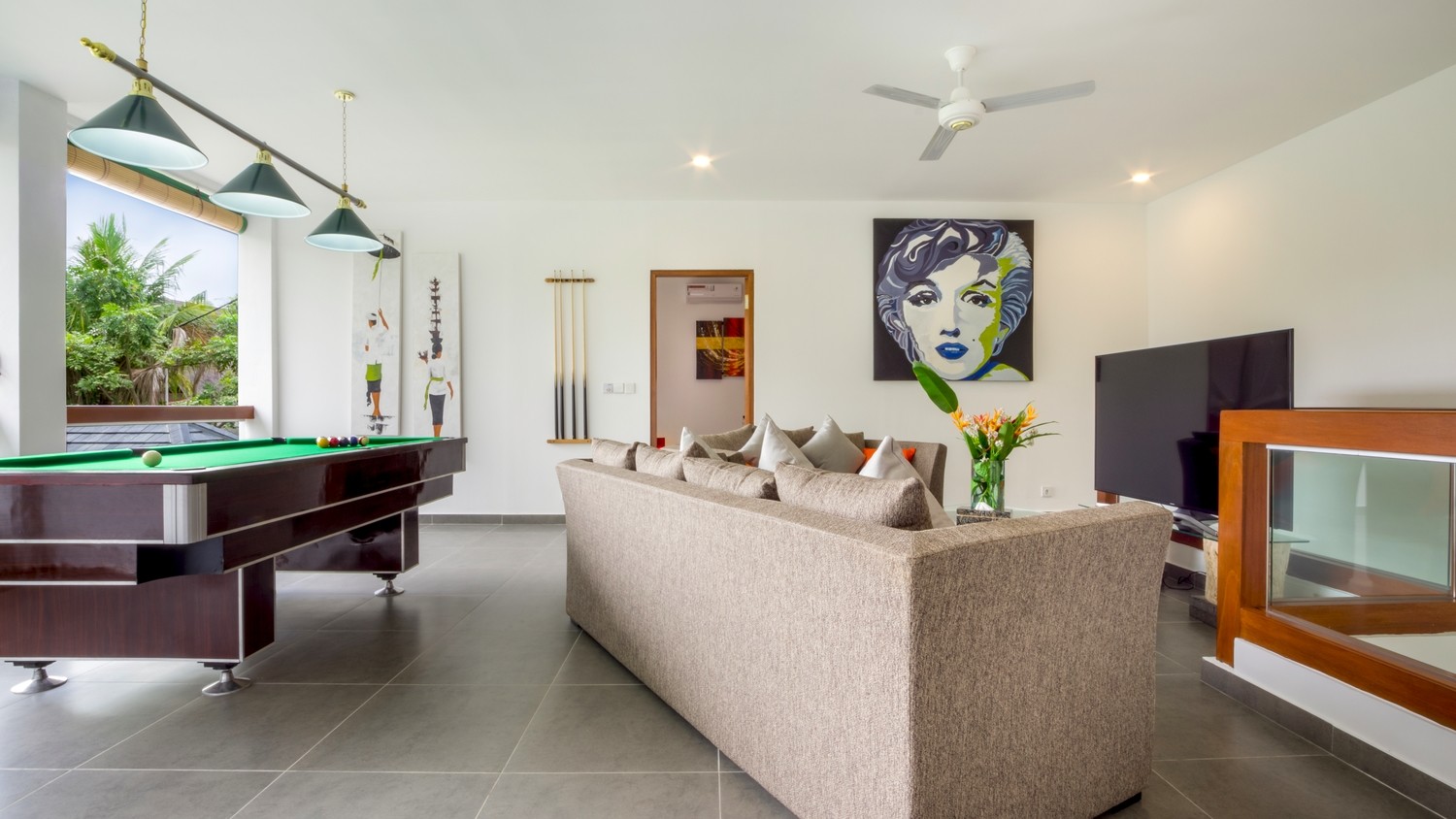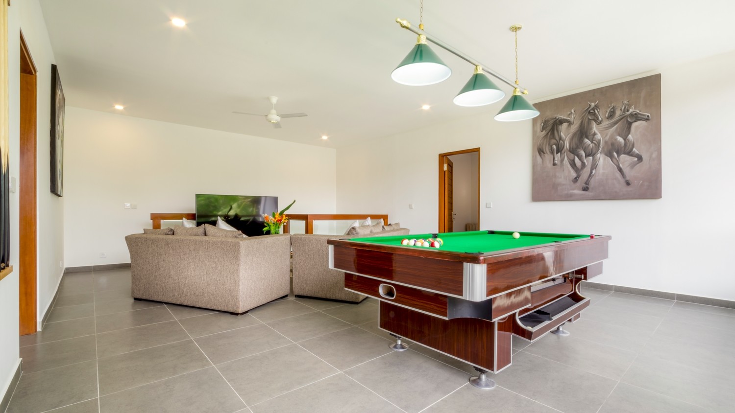 The villa is well-furnished and the open-concept living area at the villa is located poolside with sliding, glass doors to help you move around with ease. It is furnished with comfortable and plush circular, rattan chairs that sit facing a large, flat-screen TV for your entertainment. But this is not all, as there are even bigger media/games rooms right upstairs as you ascend the steps. With comfy couches, a pool table, and an even bigger TV, this would be where you can truly relax as you kick back and enjoy the show!